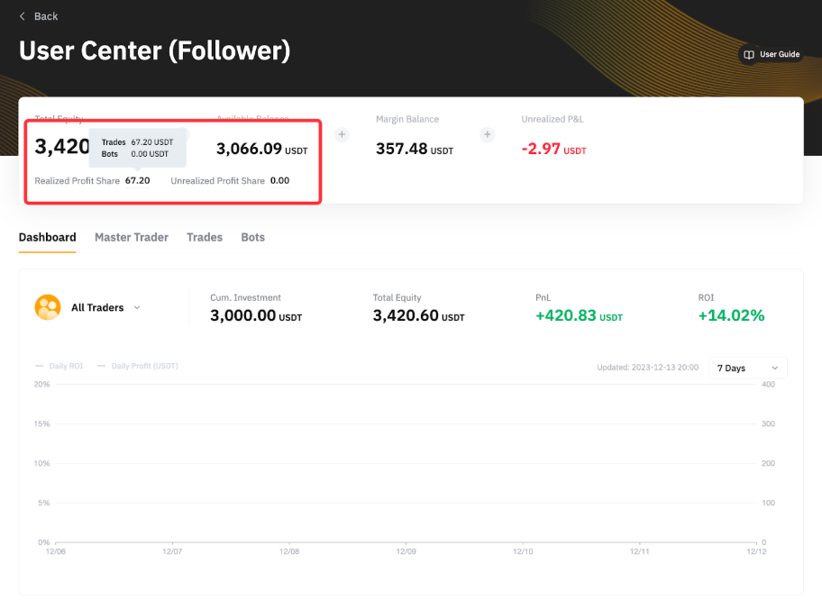 2. Unrealized Profit Share: This reflects the unrealized profit share yet to be settled. However, this amount does not represent your actual profit share to be settled on the upcoming settlement day. The unrealized profit-sharing figure is subject to change for various reasons, such as the need for refunds to followers in case the net P&L shows losses or if some trades opened on the same day remain unclosed.
