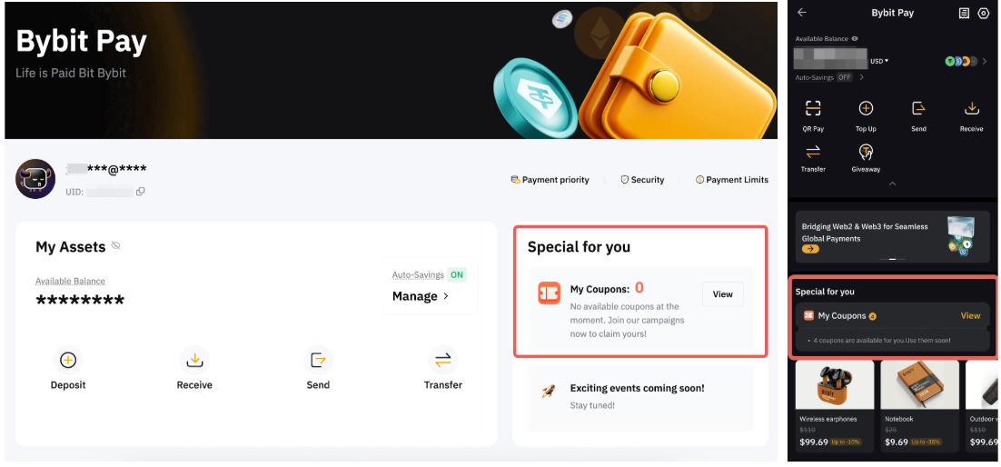 The coupons can only be used when making payments to Bybit Pay merchants or when purchasing at Feature Shop. You can view your available coupons here or visit Rewards Hub to check if there is any ongoing activity to gain the rewards.