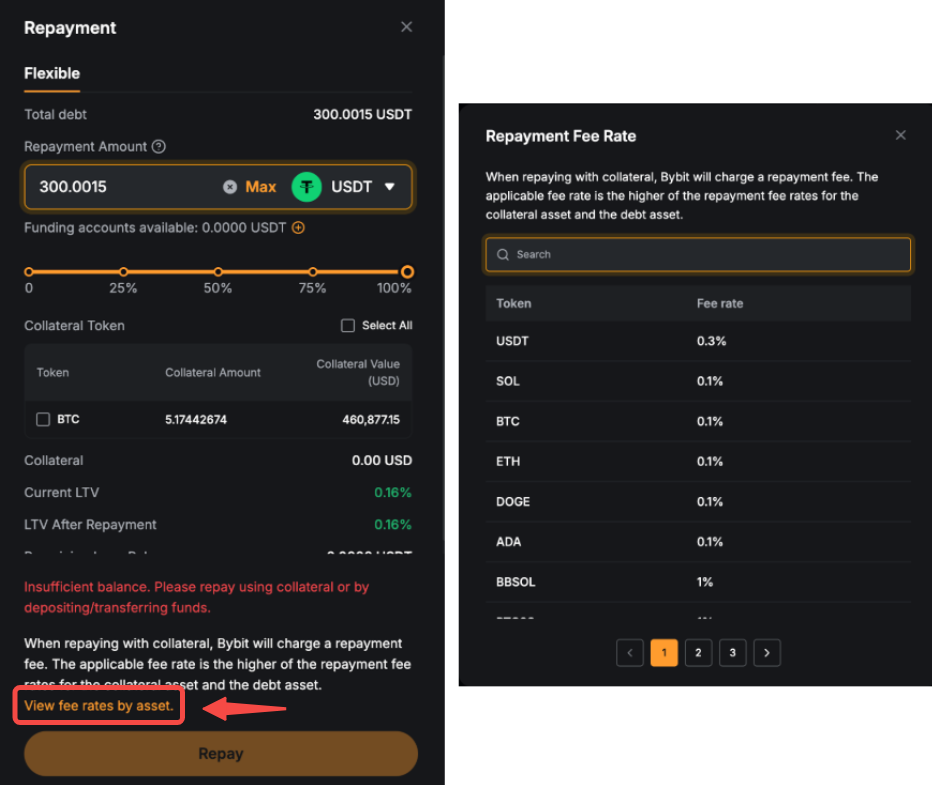 You can click View fee rates by assets on the Repayment Page to see the full list of supported tokens and their respective repayment fee rates.
