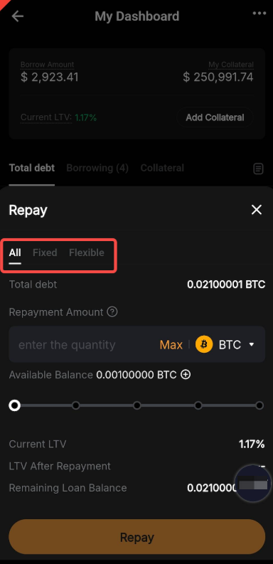 Flexible Rate Loan and Fixed Rate Loan can be repaid at any time, either in full or in part. For Flexible Rate Loan, the interest is calculated based on the actual borrowing duration, and any period less than one hour is rounded up to a full hour. For Fixed Rate Loan, the interest charged upfront when the loan was confirmed is non-refundable.