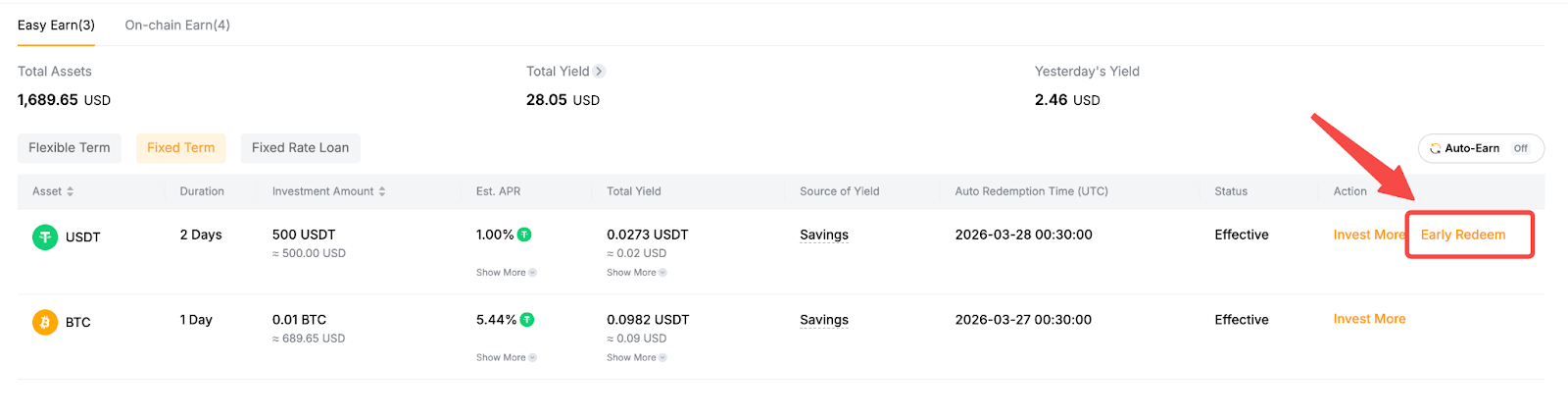 You can redeem your assets at any time. Once redeemed, your principal and any accrued yield will be immediately credited to your Funding Account. To redeem, go to AssetsEarn Easy EarnFlexible Term.