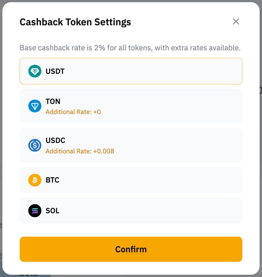 - If you would like to change the cashback token to another, tap on the coin icon and select the auto-cashback token you wish to receive.