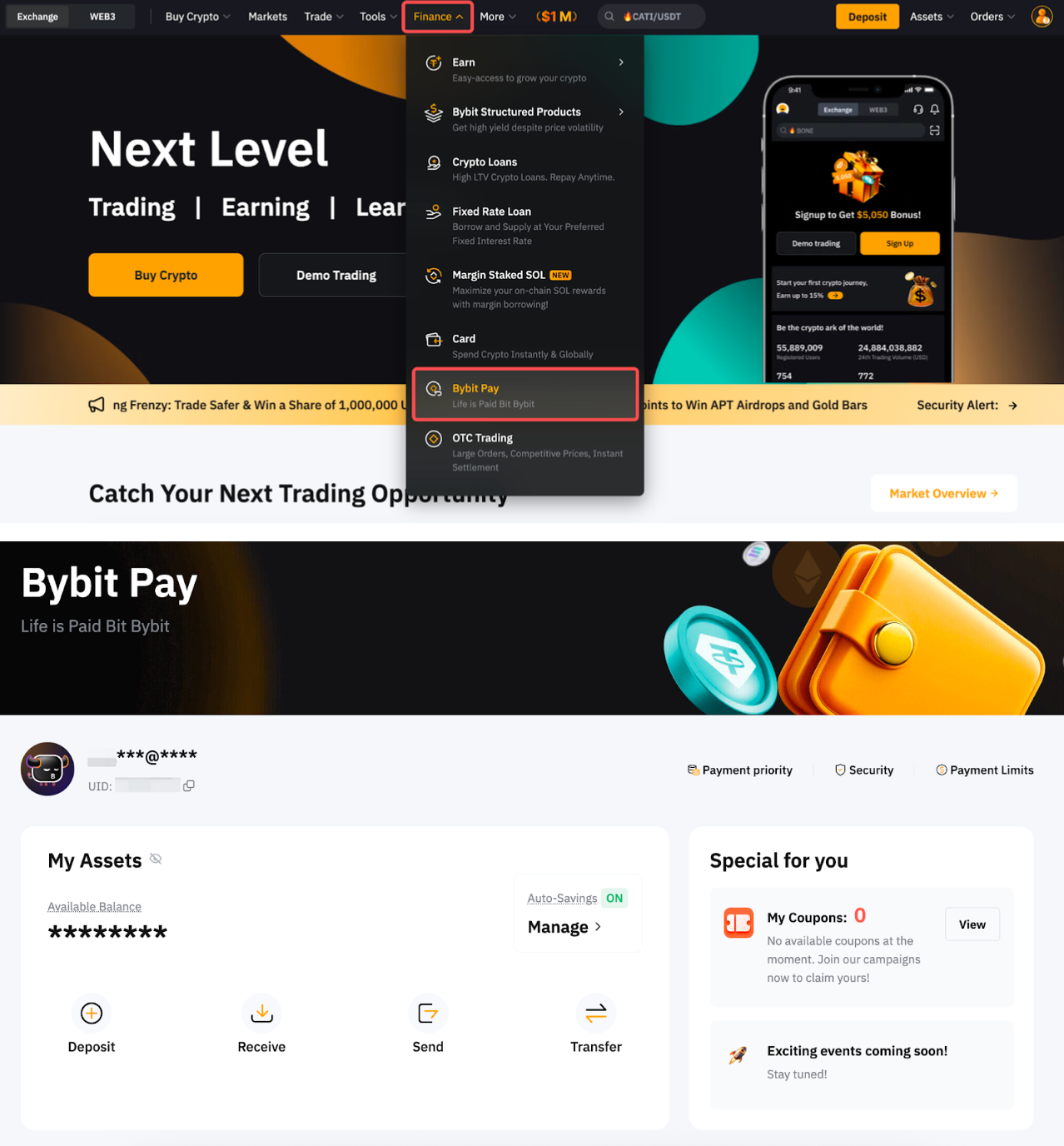 Step 1: Log into your account and hover to Finance → Bybit Pay.