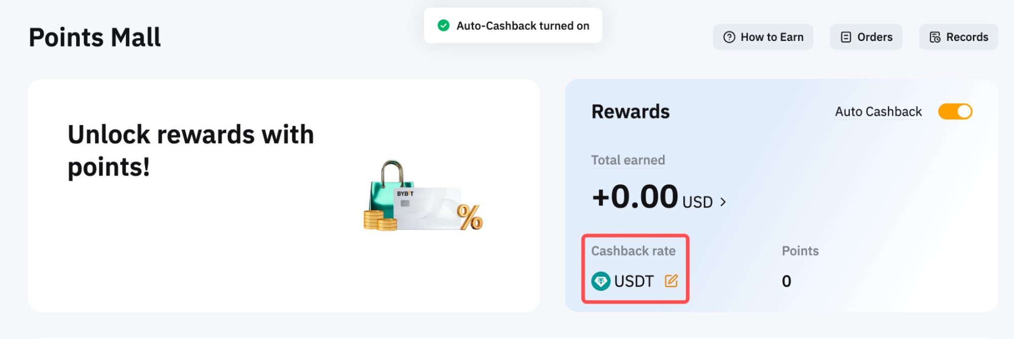 Step 4: After successfully activating Auto Cashback, you'll notice that Bybit Points have been enabled for Auto Cashback on the Bybit Pay Dashboard. The points will be converted to the selected token and credited to your Funding Account every day between 00:00 and 01:00 UTC.