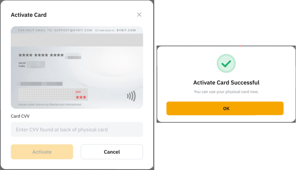 Step 5: Enter the 3-digit CVV on the back of your physical Bybit Card and click on Activate and you can now use your physical Bybit Card! If you haven’t provided a Mobile Number and Billing Address yet, you need to input the information before entering the CVV.