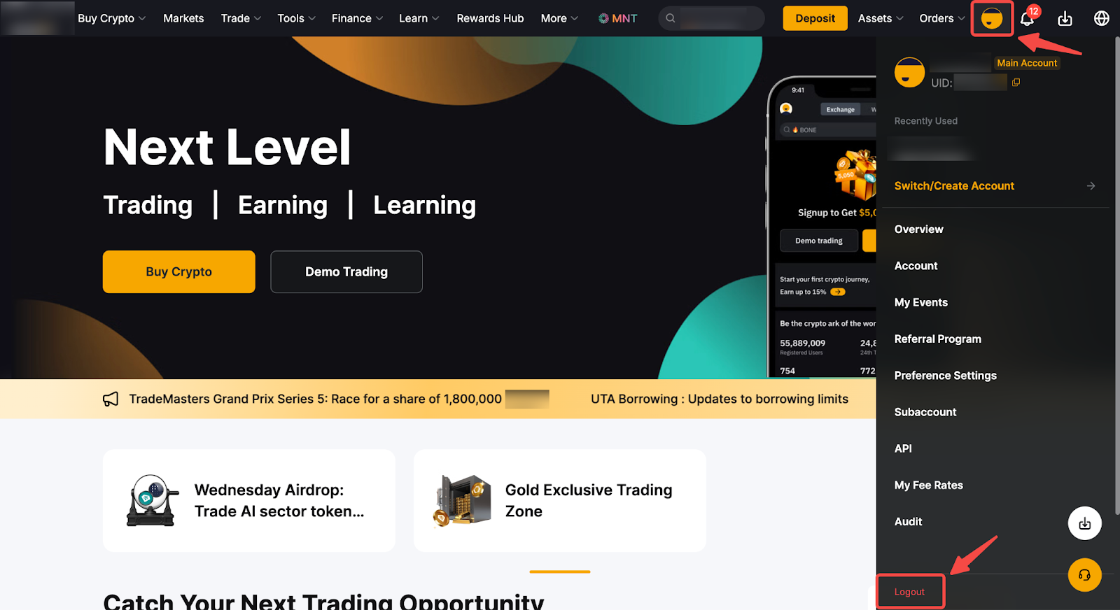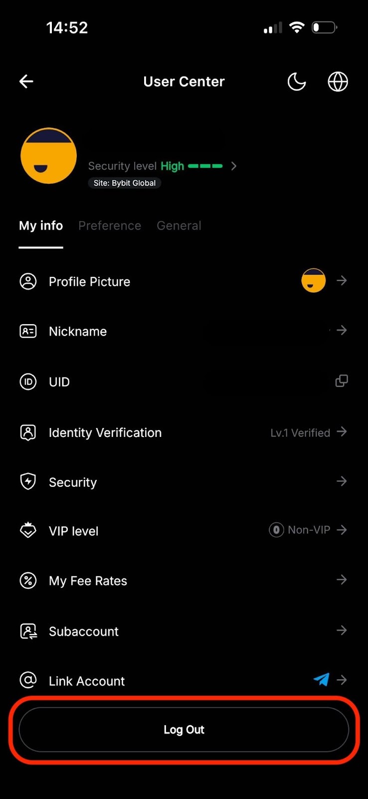 To log out your Bybit account through the app, you can go to your User Center and then click on the Log Out tab. For the website, you can click the profile icon on the top right corner (step 1) and then click on the Logout tab (step 2).
