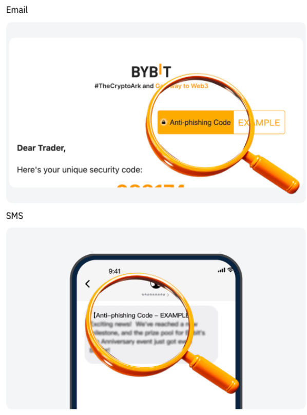 Bybit’s Anti-Phishing Code is a personalized security feature consisting of a unique combination of letters, numbers, and symbols. Once enabled, this code will appear in all official emails and text messages from Bybit, allowing you to easily verify the authenticity of information you receive.