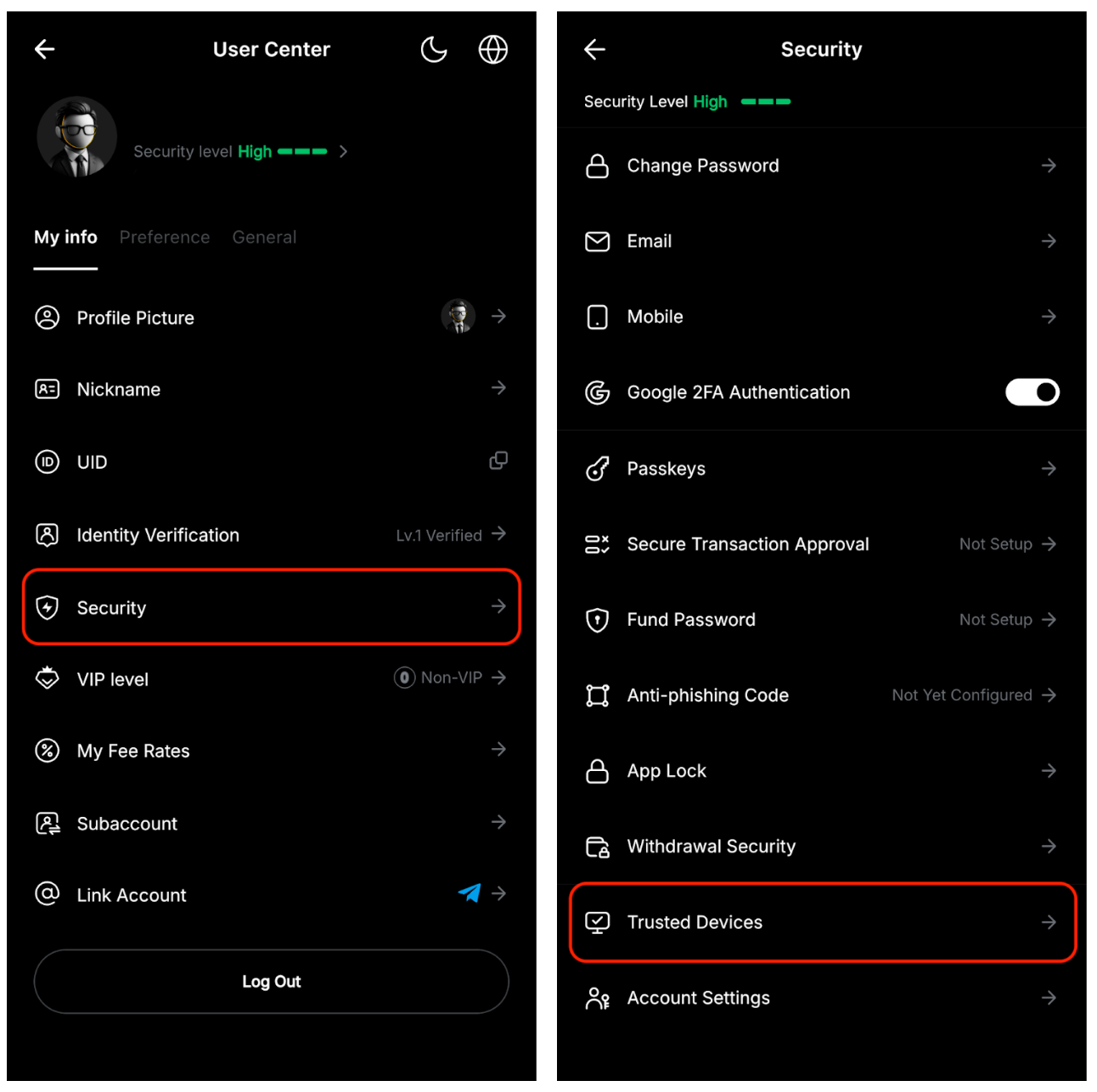 Go to your User Center page, tap Security Trusted Devices