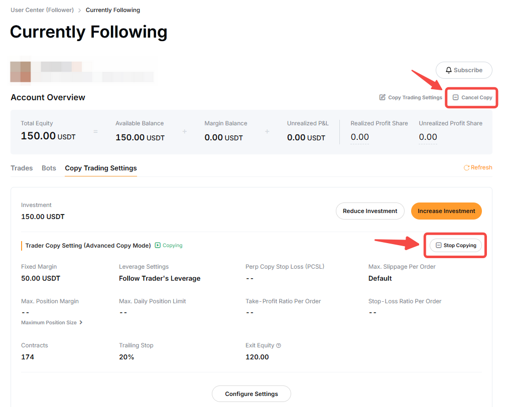 Margin Mode and Leverage Settings: To change the margin mode or leverage, you can refer to the steps above on how to edit your copy trade settings. Leverage change does not apply to Smart Copy mode as you will follow the Master Trader’s leverage.