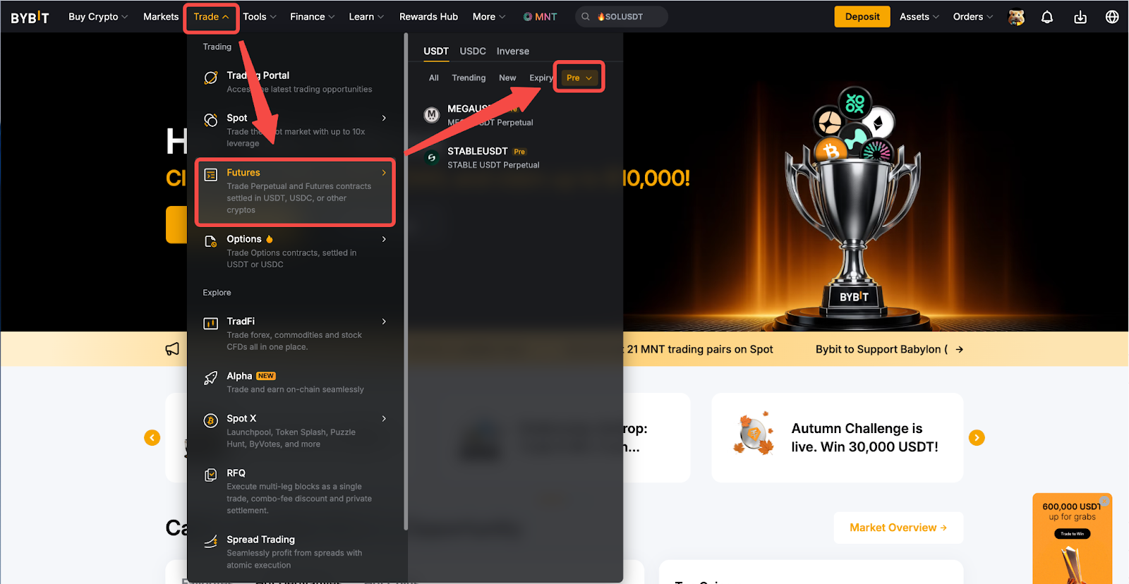 Step 1: Navigate to the Trade section on the navigation bar, move to Futures and click on Pre to see the ongoing Pre-Market Perpetuals contracts.
