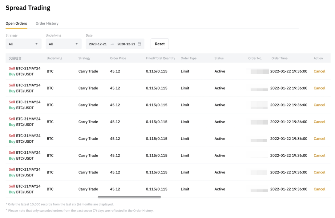You can also track your orders by clicking Orders → Spread Trading. Switch between Open Orders and Order History to view active or completed orders. To cancel an active order, simply click Cancel under Action.