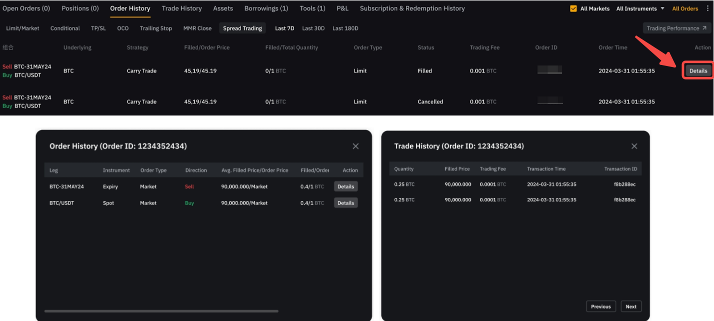 For completed orders, navigate to Order History and click Spread Trading. Click Details under Action to view order information on each leg. Click Details again for additional insights.