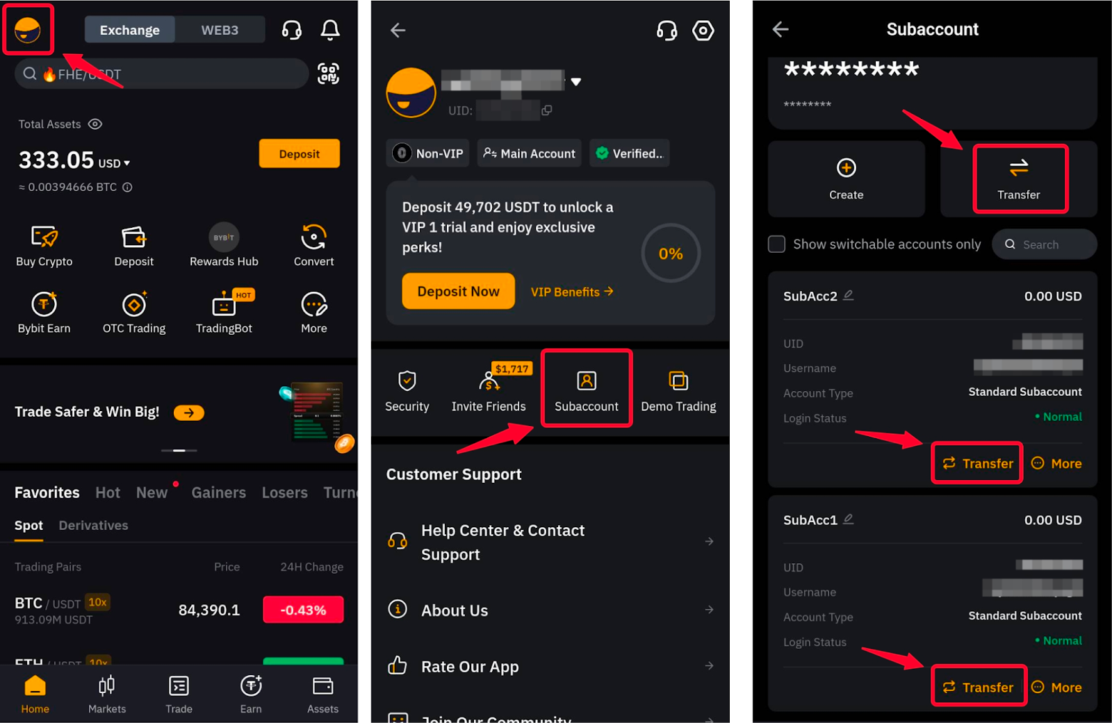 — Logged into your Subaccount through the login page using your Bybit username and password. In these cases, only transfers back to the Main Account or within the same Subaccount will be supported.