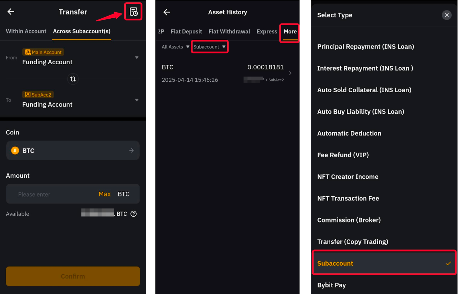 Note: The Subaccounts Transfer History will include both transfers between Main account and Subaccounts and between two Subaccounts.