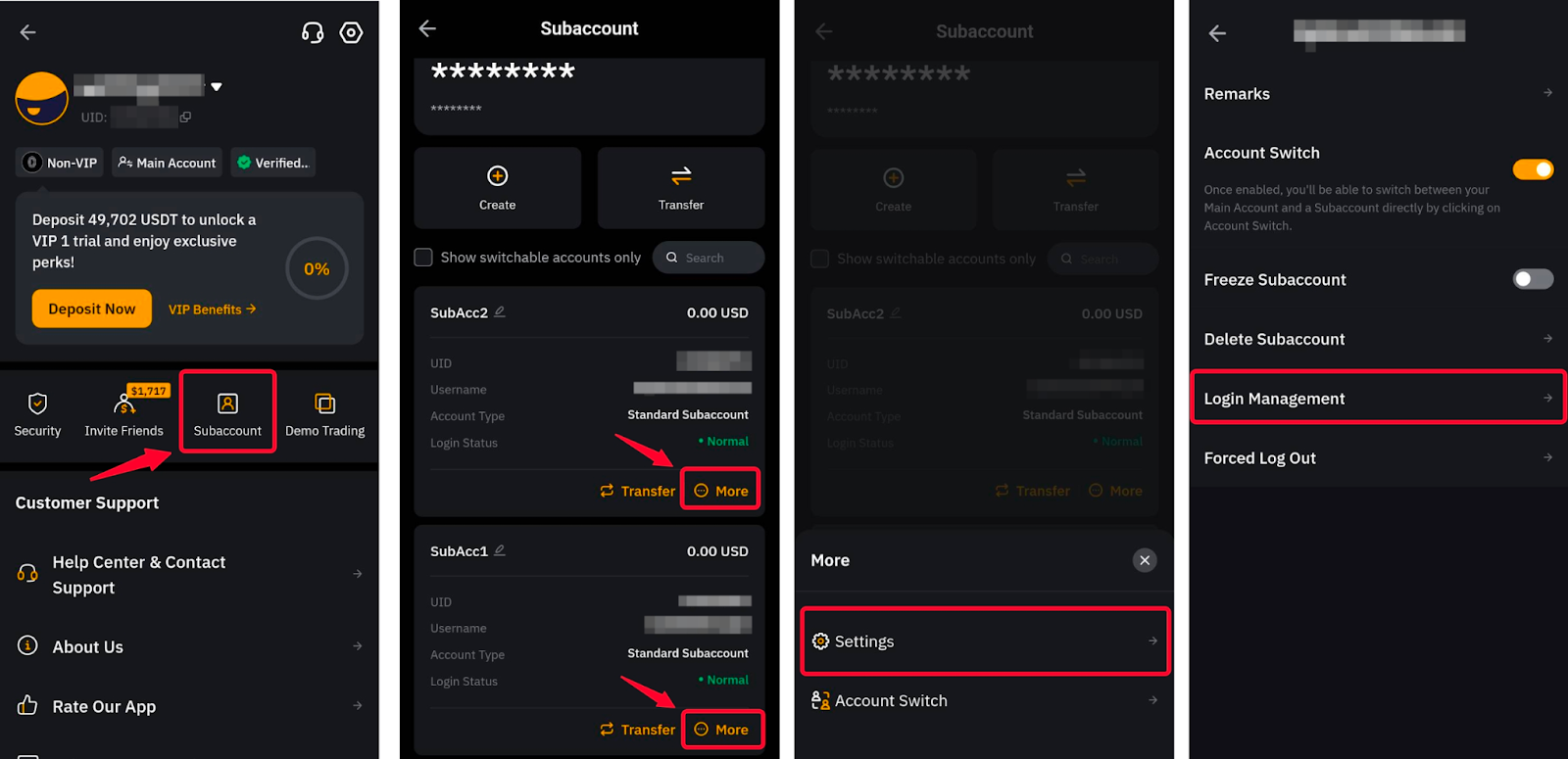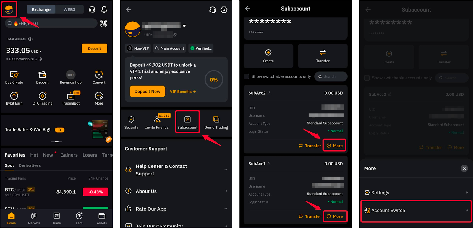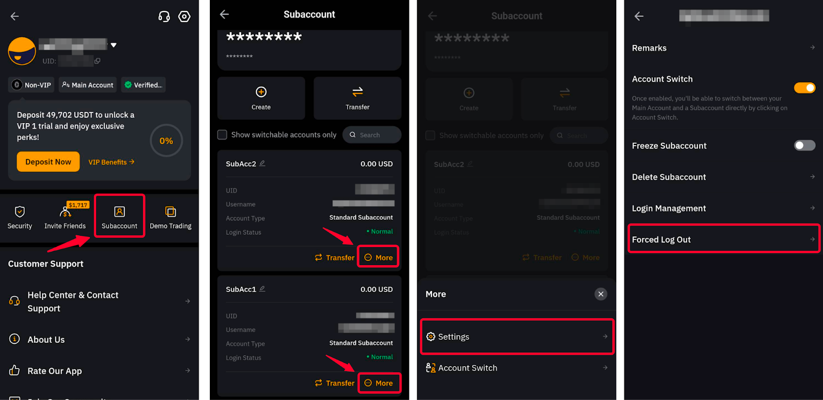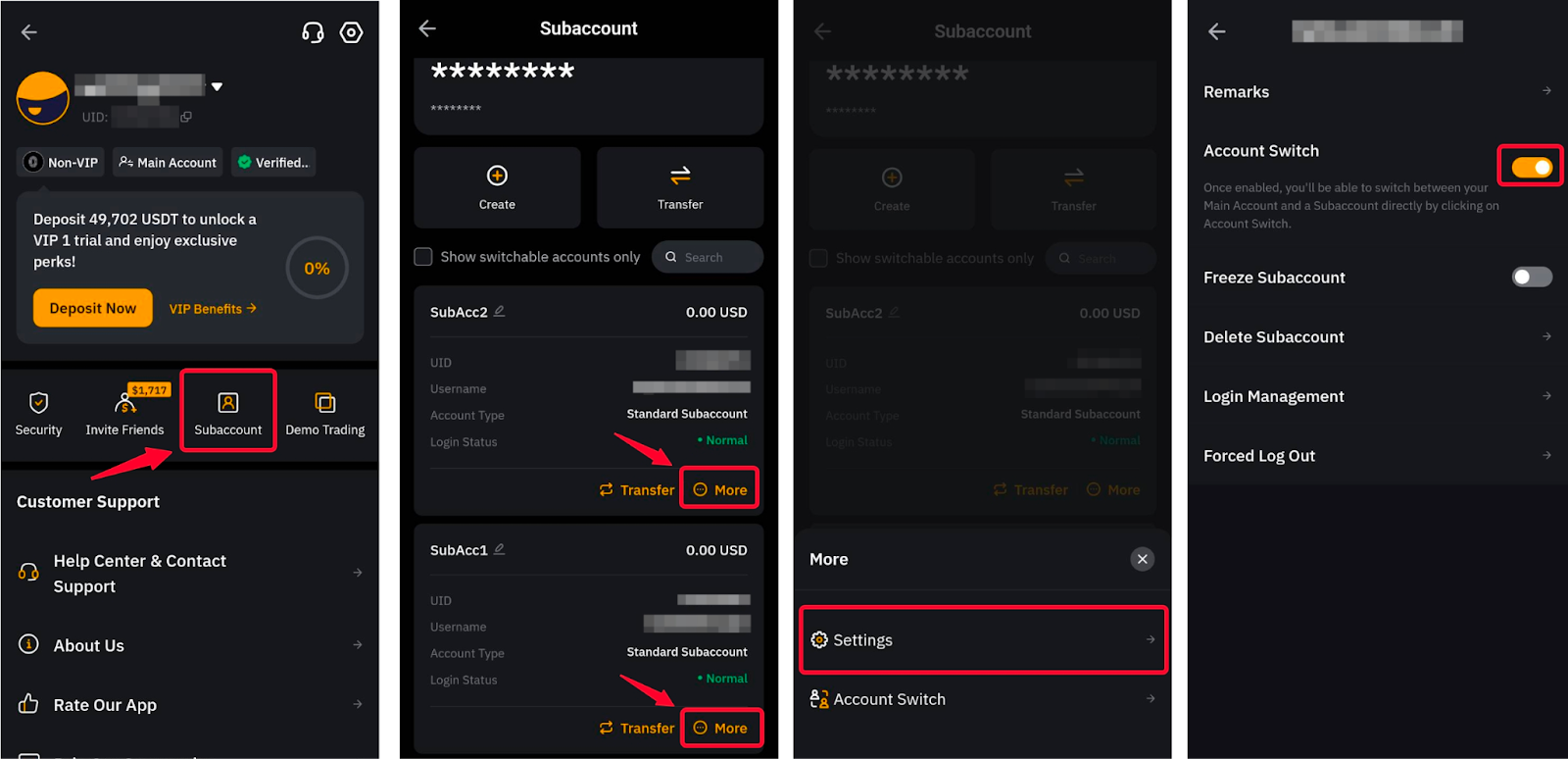 Method 3: Tap on your profile picture in the top-left corner of the homepage and open the Subaccount page. Locate the subaccount that you want to open and click on More → Account Switch and you will automatically log it to your selected subaccount.
