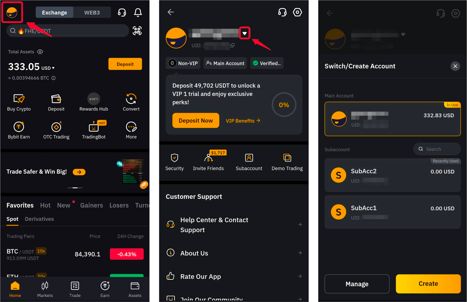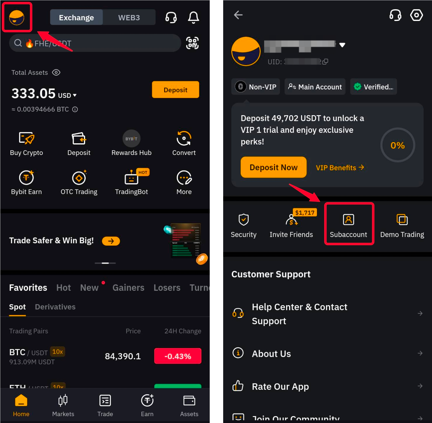 Step 1: Log in to your Bybit App and tap on the profile icon on the top-left corner to access the Subaccount tab.