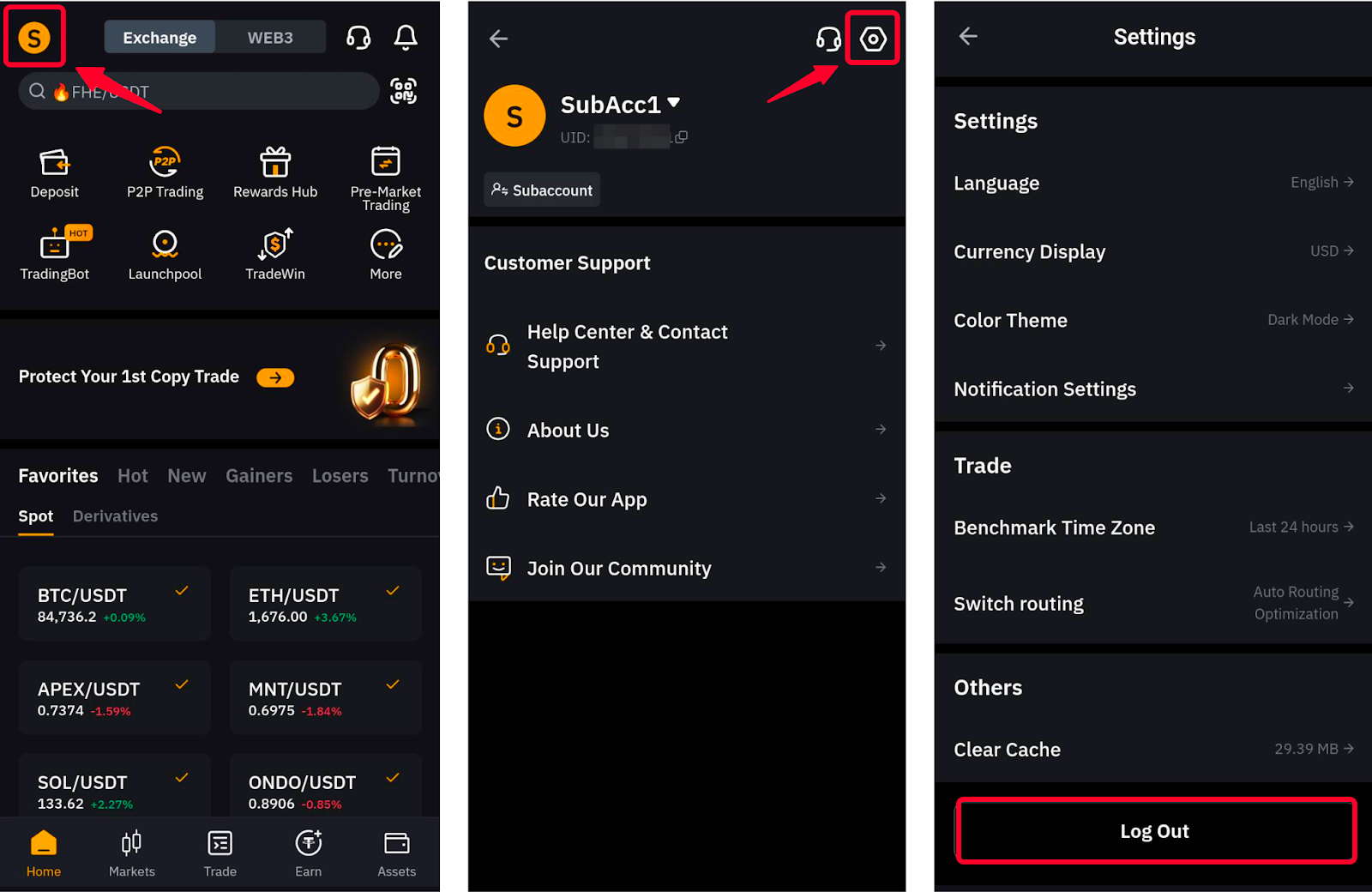 When logged in via the Bybit login page, you will be able to log out from your subaccount by tapping on your profile picture in the homepage, opening the settings page and scrolling down to the end of the menu to tap on the Log Out button.