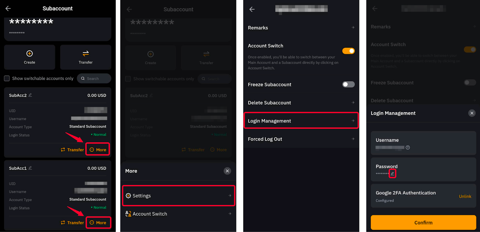 As for the password update, simply go to the relevant subaccount, tap on More → Settings → Login Management and tap on the pencil icon that you see next to your subaccount nickname. You will be requested to indicate your new password and to confirm the update by entering your main account’s 2FA verification code.