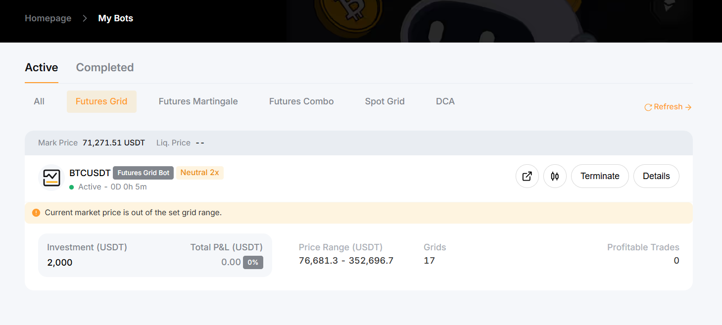 To terminate your Futures Grid Bot, go to the details page of your Futures Grid Bot and click on Terminate.
