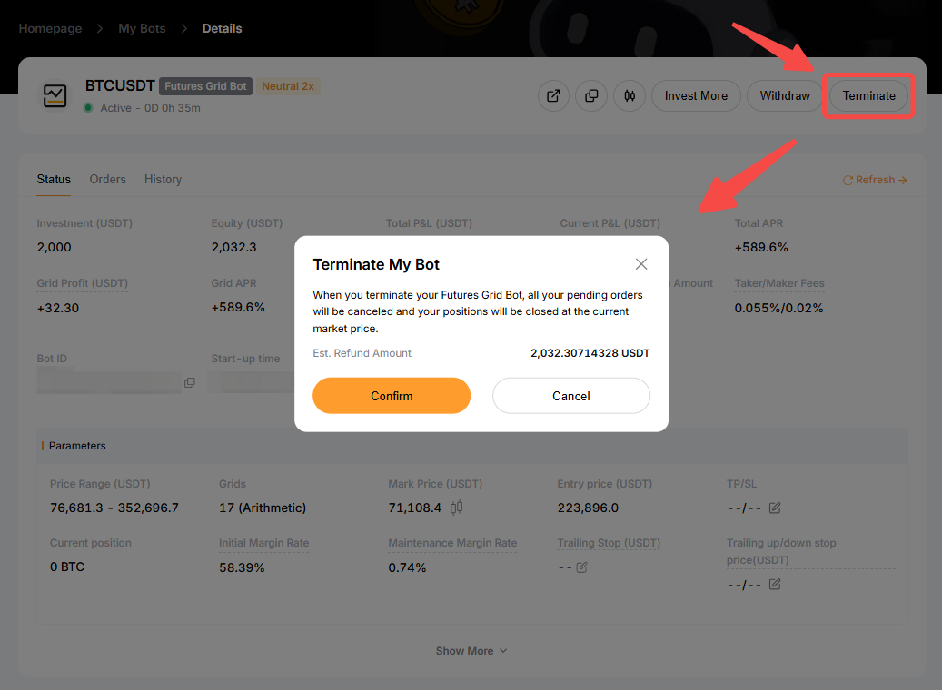 Once the bot is terminated, all pending orders will be canceled, and your funds will be returned to your Funding Account.