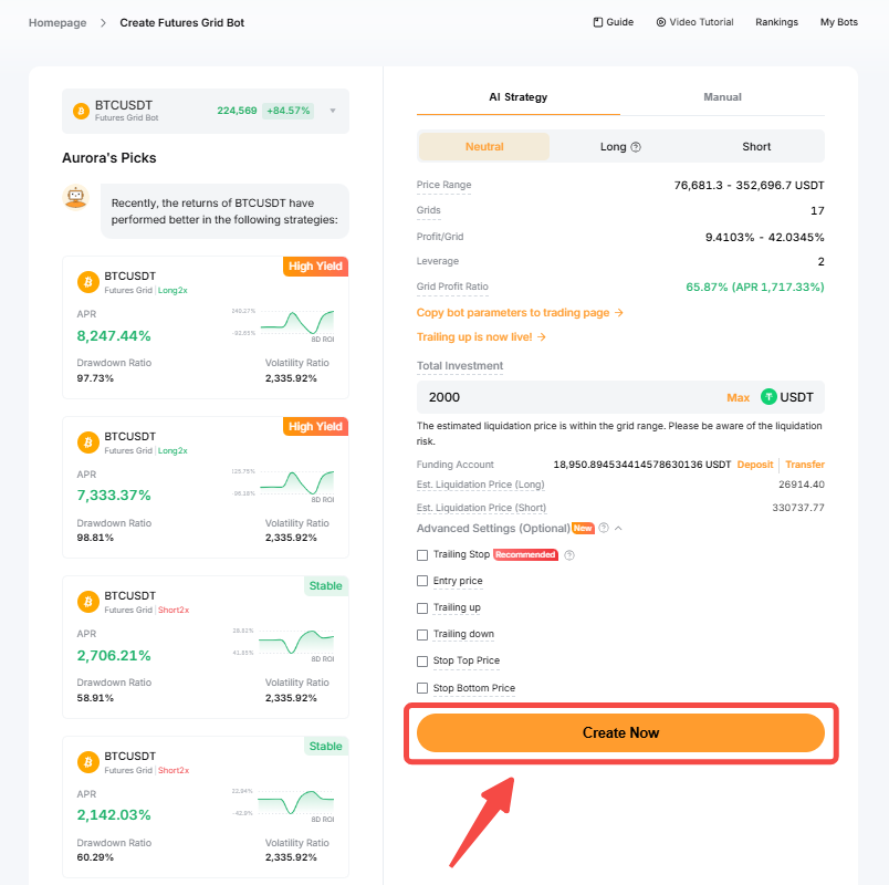 By using AI Strategy, the system will suggest the parameters based on the historical data performance of the Futures trading pair. Alternatively, you can also refer to the suggestion from Aurora’s Picks to create a Futures Grid Bot based on your preferences.