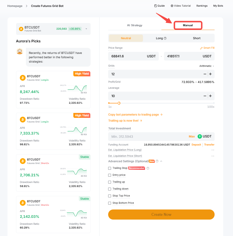 You can create a manual Futures Grid Bot via both the Trading Bots Page and the Futures Trading Page.
