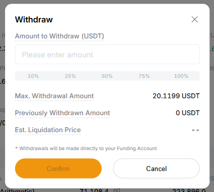 The maximum amount that can be withdrawn is your grid profit after the fee deduction. You can refer to the Max. Withdrawal Amount which is displayed on the withdrawal window. The withdrawn amount will be credited to your Funding Account.