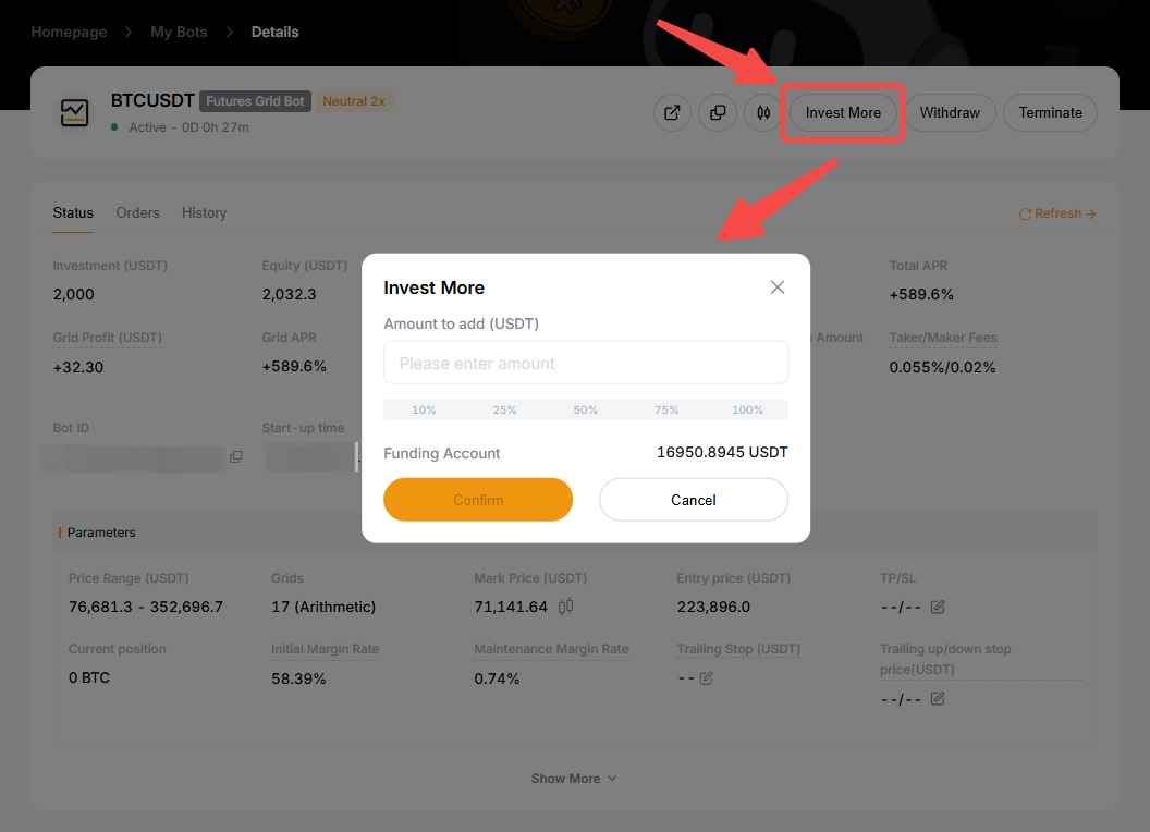 Once your Futures Grid Bot is created, you will be able to invest more funds into the Grid Bot by going to the details page of your Futures Grid Bot and clicking on Invest More.