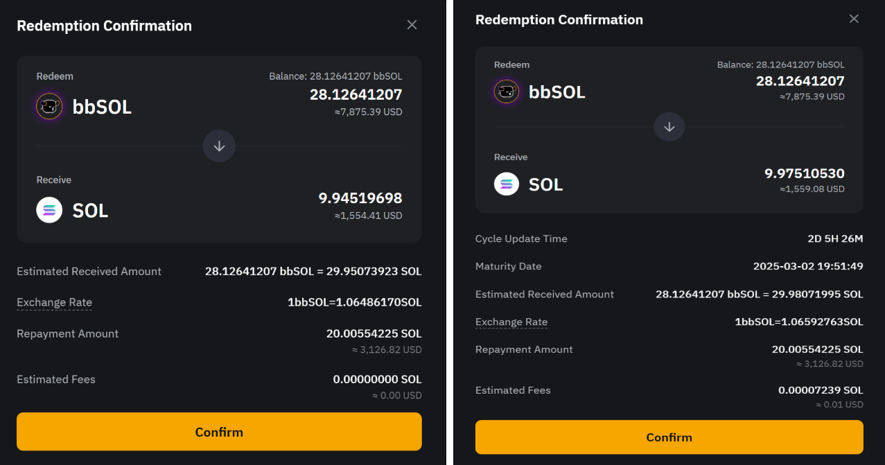 • Postponed Redemption: Get your full principal and all earnings after a 1‒4 day processing period, during which interest will continue to accrue. Your bbSOL will be converted to SOL at the real-time exchange rate when you submit your redemption request.