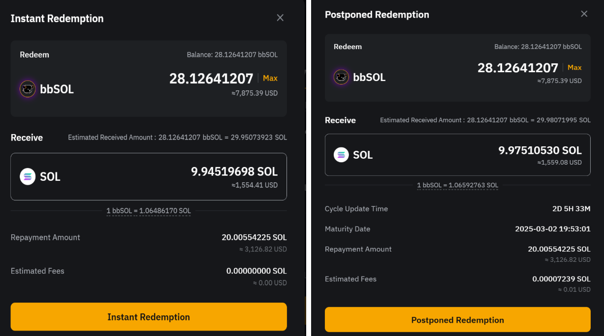 Step 3: A confirmation pop-up will appear. Enter the amount of bbSOL you wish to redeem or click Max to redeem your full balance. The system will automatically calculate the total SOL you'll receive based on the real-time exchange rate, as well as the final amount after deducting loan repayment and any applicable fees. Review the details carefully, then click Instant Redemption or Postponed Redemption to proceed.
