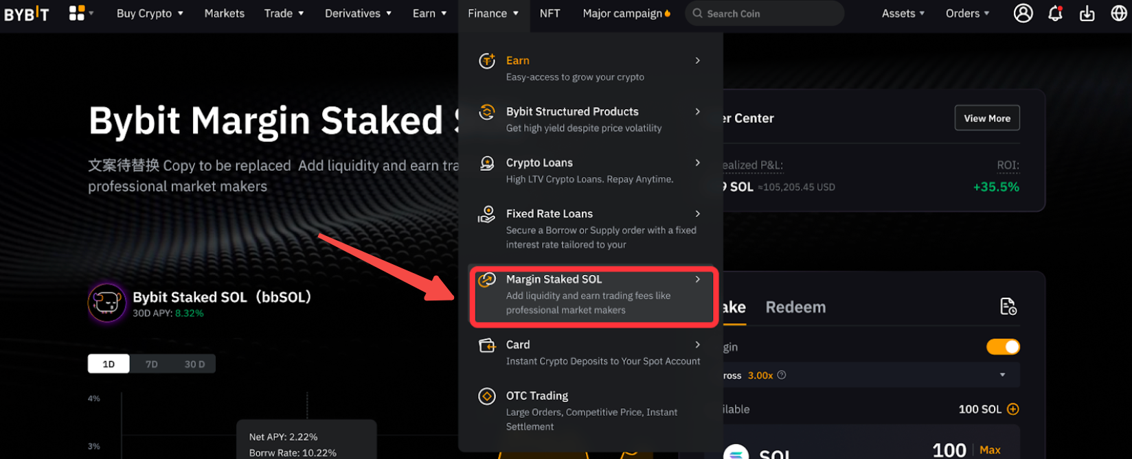 Step 1: Click on Finance → Margin Staked SOL in the navigation bar to access the Margin Staked SOL page.