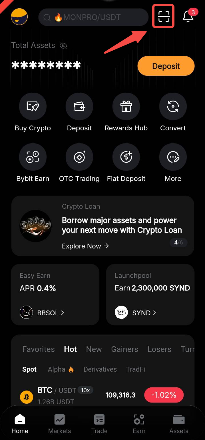 Step 2: Launch the Bybit app and tap on the QR code scanner icon in the upper right corner. Please make sure you are logged in to your Bybit app.