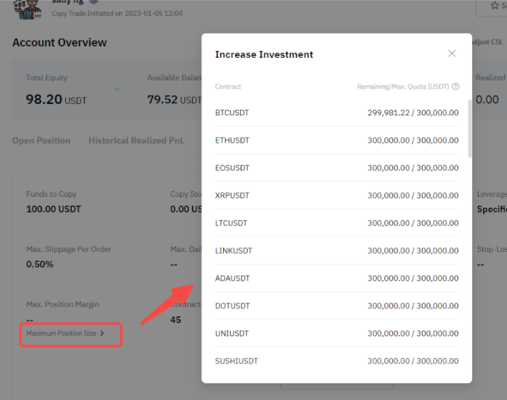 The maximum position size shows the remaining and maximum order value that can be followed for your copy trades derived from your position sizes in both long and short directions.
