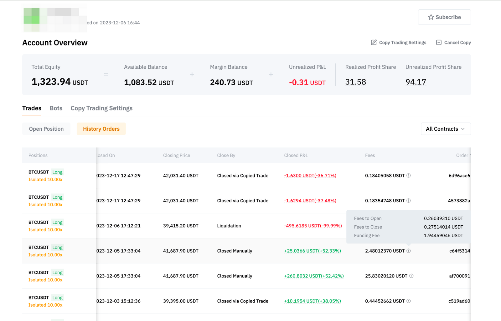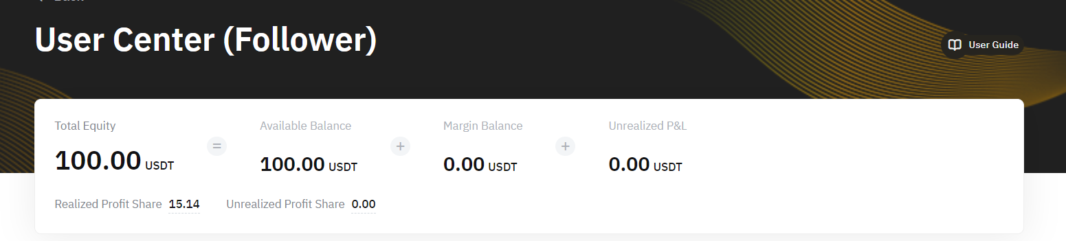 From the Copy Trading User Center (Follower), you can have an overview of your Copy Trading Account, the current or past performance of your followed Master Trader and the order details.