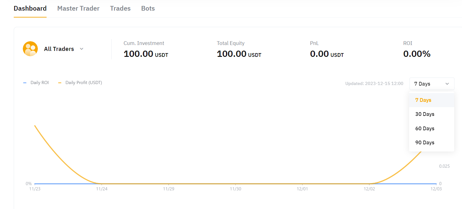 You can view the results of the current P&L and ROI of all following Master Traders, or you can filter each Master Trader to view the results individually.