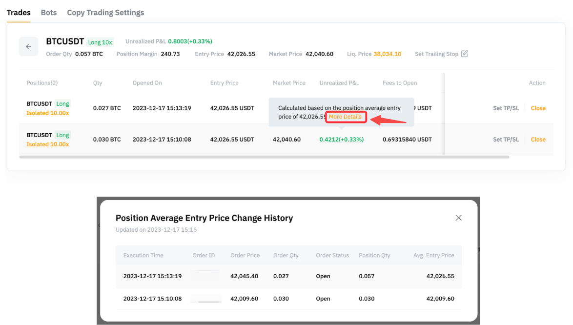 Under the position Details, you can see the details of each order copied for the position. Please note that the Entry Price displayed in the position details is the position average entry price. To check how the position entry price is derived, you can move your cursor to the Unrealized P&L and click on More Details to see the Position Average Entry Price Change History.