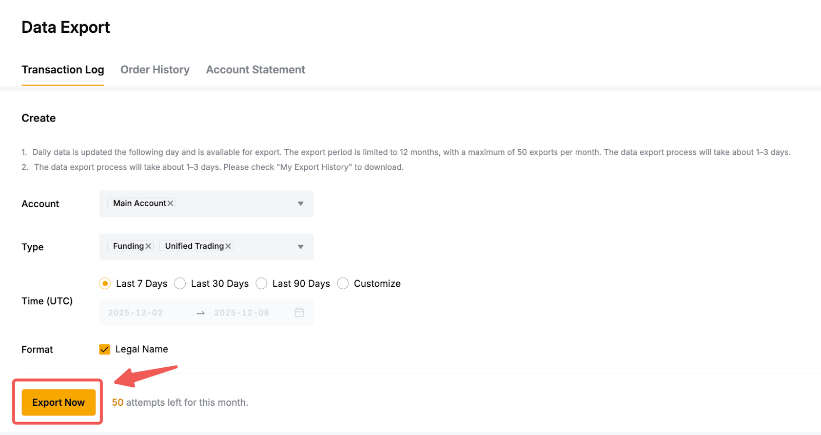 - Up to three (3) years of recent data can be retrieved. However, the export period is limited to one year (12 months), with a maximum of 50 exports per month for all the data types. For example, if you have requested data export for both Transaction Log and Account Statement, you will have 48 remaining exports within that month.