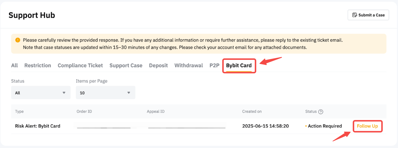 Bybit will make a final decision based on the information and evidence you provide. Once your request is approved or rejected, it will no longer appear in the Support Hub. You will receive an email notification with the status update.