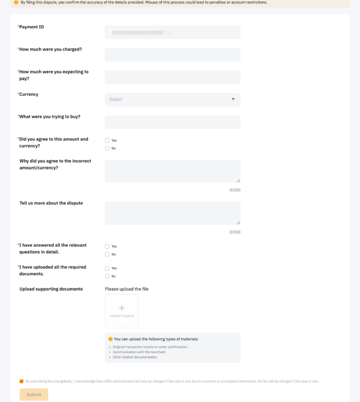 Note: Please ensure that you have contacted the merchant directly and waited at least 14 days for a resolution before submitting an official dispute with Bybit.