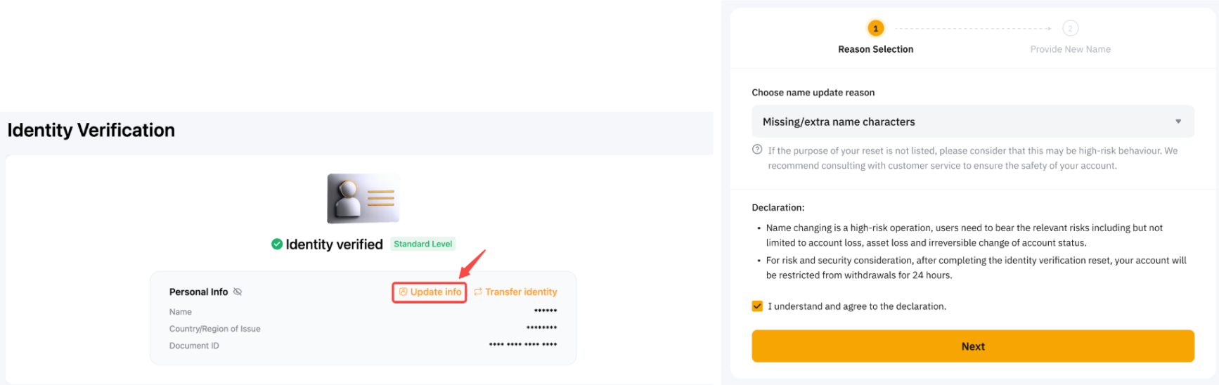 You can update your KYC name by clicking on the Update info on the Identity Verification page or by directly accessing the page here. You will need to select the reasons, complete the security verification, and provide the correct name. The process usually takes about 5 minutes. However, it may take up to one (1) working day for further review. If the processing time has exceeded, you can check the status on Support Hub.