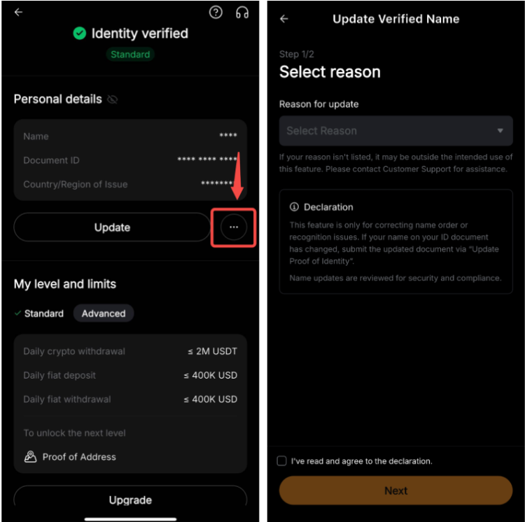 If you meet these conditions, you can go to the Identity Verification page and click on Update to proceed with the update request. The process will take approximately two hours.