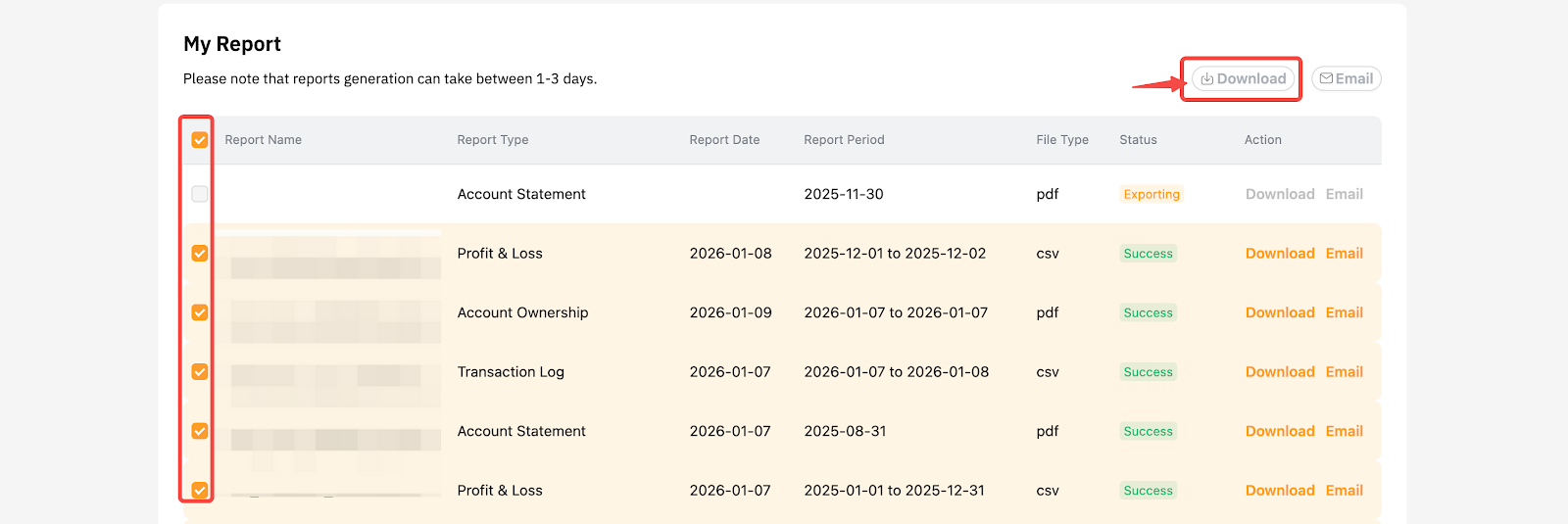 Alternatively, if you want to download your reports in a batch, you may multi-select the reports and click "Download" at the top to download selected reports.