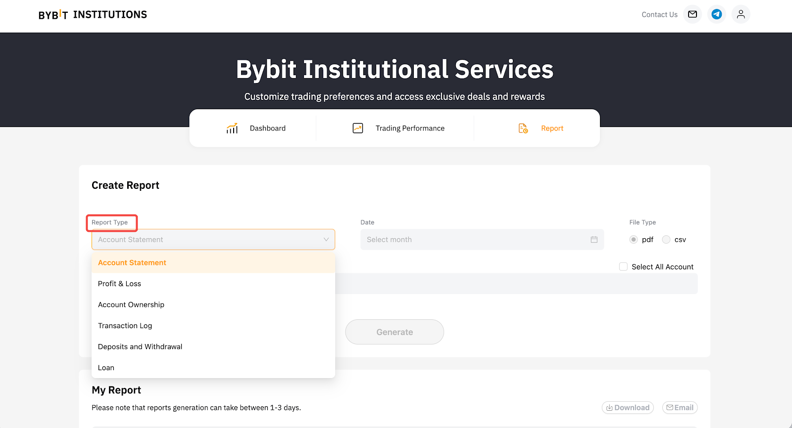Institutional Reporting is a self-service data exporting tool within the Bybit Institutional Portal. PRO users and Marker Makers can download and share the reports of their main accounts and subaccounts activities internally and externally if necessary.