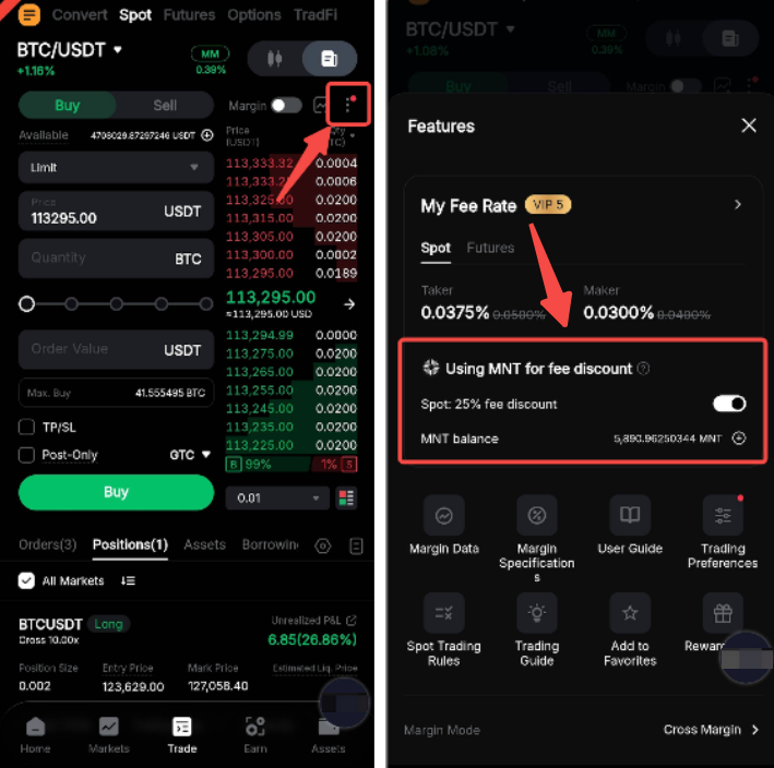 Suppose you're a VIP 4 user with a 0.0600% Taker rate. Buying 10 BTC on Spot with a market order would normally cost 0.006 BTC in fees. By paying with MNT, the fee is reduced by 25% to 0.0045 BTC worth of MNT. For more details, please refer to FAQ — Paying Trading Fees With MNT.