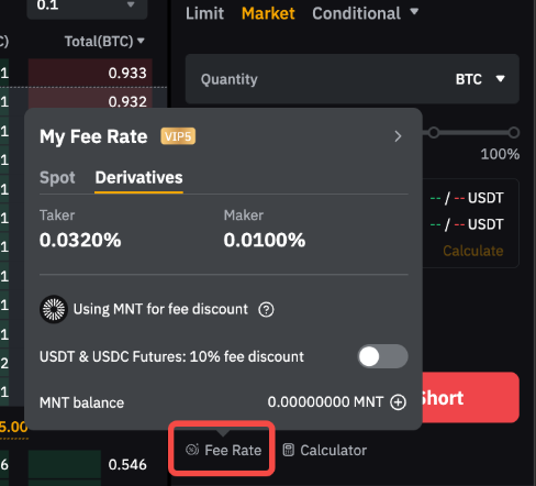 On the web trading page, click Fee Rate and turn on the Using MNT for fee discount option.