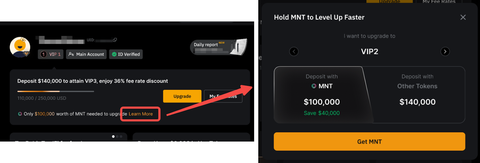 If you are interested to know how much more you need to deposit to level up, you may go to your VIP Me page by clicking your profile picture in the upper-right corner of the screen. Then click the Learn More button next to the “Only a $ {certain amount} worth of MNT needed to upgrade”