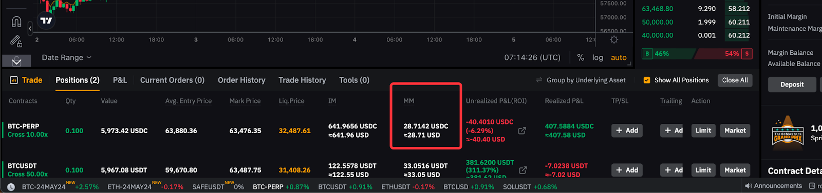 You may notice that the MM displayed on the position tab will be higher due to the reason that it includes the estimated fee to close the position.