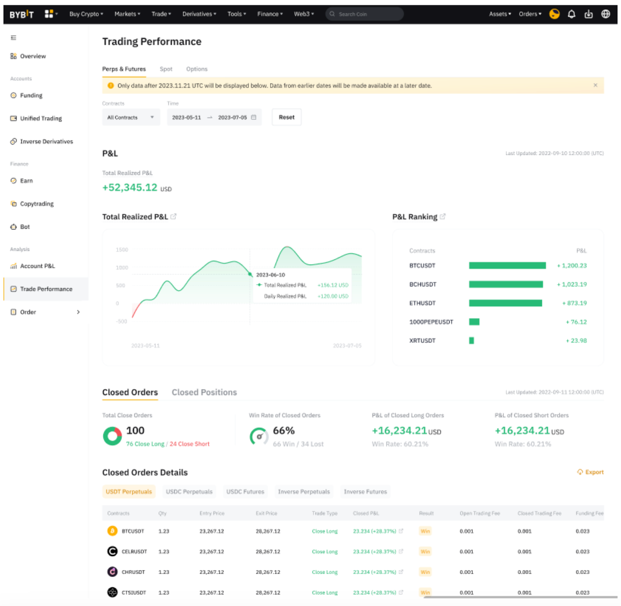 This shows the Closed P&L of all closed orders. Closed P&L = Position P&L - Opening Fee - Closing Fee - Funding Fee |